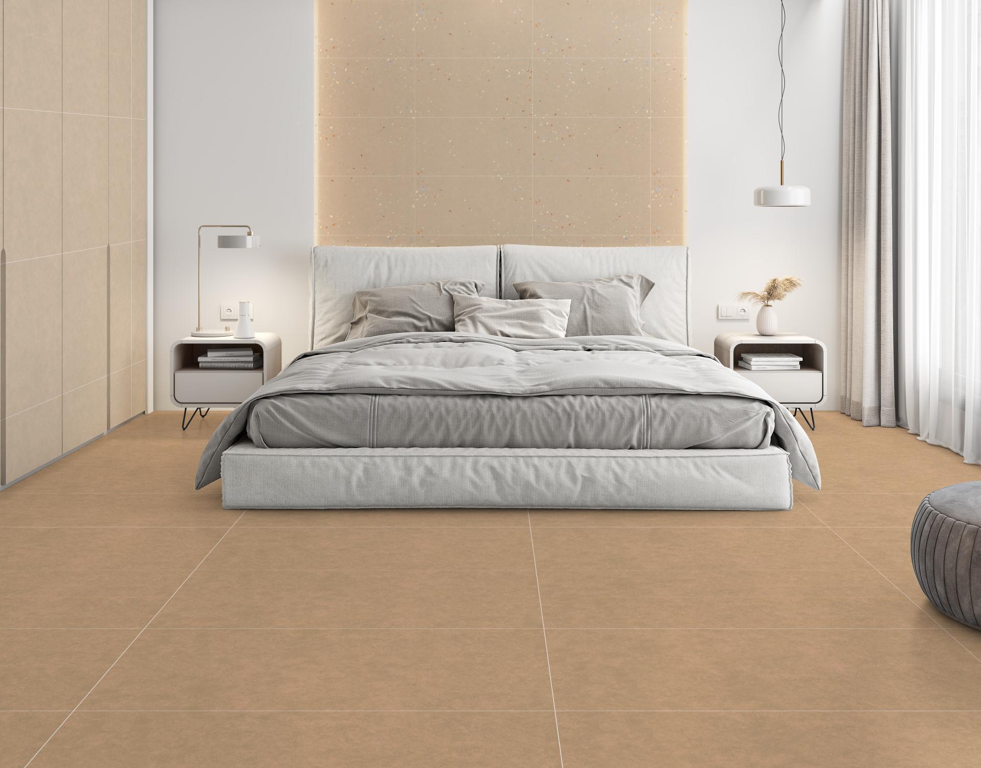 Lát nền/tường phòng khách, phòng ngủ: dùng Cement làm nền, phối Terrazzo làm mảng nhấn.